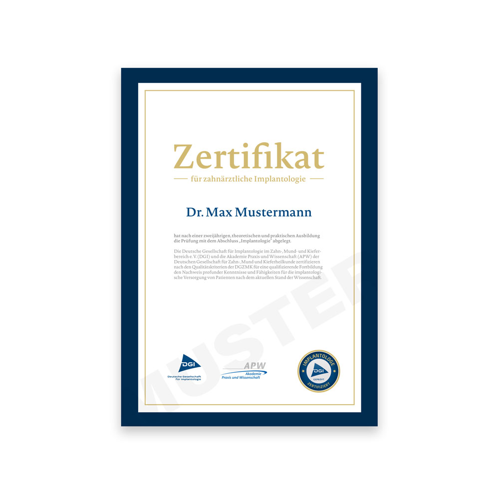 Mit Beschluss vom 18.01.2025 hat der Vorstand der Deutschen Gesellschaft für Implantologie e.V. die Zertifizierung zum Implantologen entfristet. Hier haben Sie die Möglichkeit, eine neue unbefristete Urkunde zu bestellen.